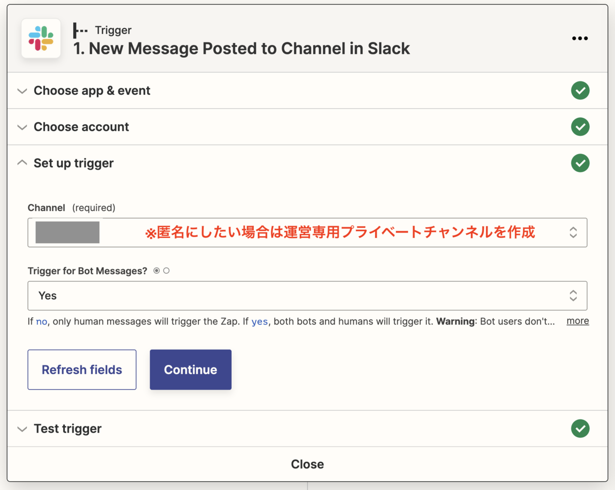 まずは、Slackのどのチャンネルに届いた情報をもとにZapierを発動させるのか。そのトリガーを設定していきましょう。