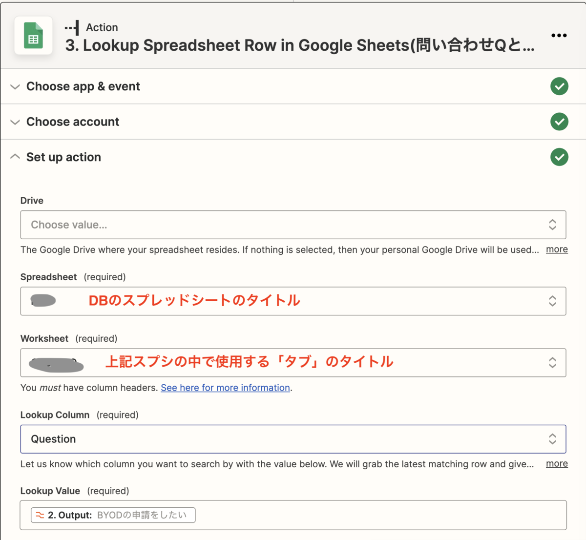 - Choose app&event : Lookup Spreadsheet Row in Google Sheets